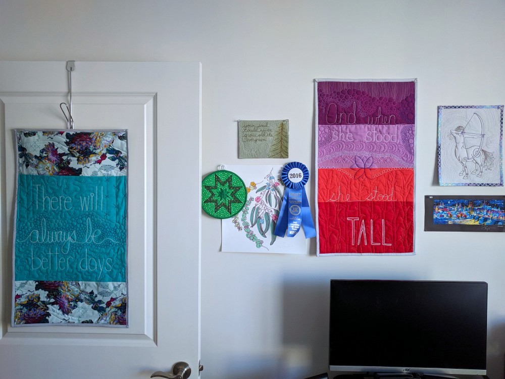 While I was taking pictures of the new quilt, I realized the original Note to Self mini quilt was hanging nearby. I had to get a picture, even though the light wasn't totally ideal. My approach to these mini quilts hasn't changed much over the past year, but I still feel like I want to explore this style even more.