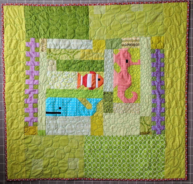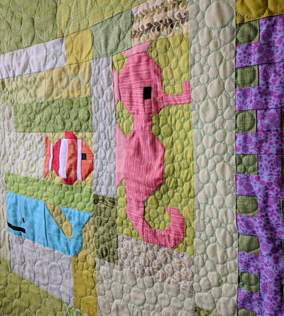 As I mentioned in my last post, the animals are a LOT of piecing work. My niece helped me get all the pieces organized for the seahorse and even sewed some of them together while I continued cutting. Throughout the next few weeks, I sent her updated photos of the quilt as it developed. My goal was *just* to use the pattern for the animals and seaweed, and to piece everything together improvisationally.
