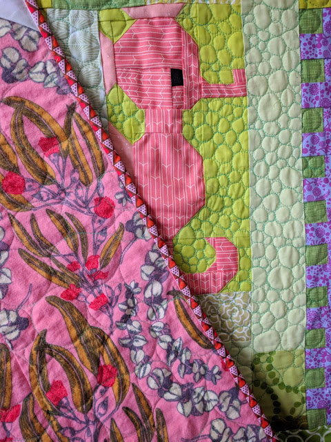 I really love that she chose to make the ocean green instead of blue. I think it adds such a unique look to the quilt. Plus, the backing is some beautiful Anna Maria Horner flannel that I had left over from my epic AMH medallion quilt - I had just enough! My niece agreed that the backing was perfect (I think it even looks a bit like sea plants - see below).