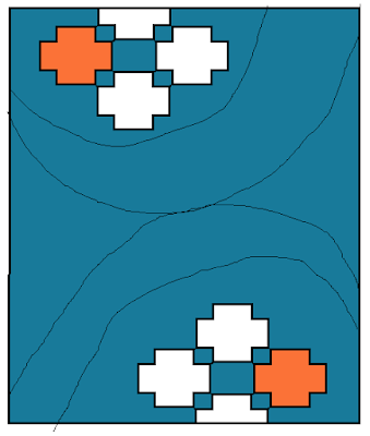 I liked the idea of using a short, somewhat squat version of the Greek cross because it seems more unexpected and unusual. When designing this quilt, I thought it would be interesting to let part of the design disappear off the quilt, and after playing around, it seemed even more appropriate to include 2 different groupings of crosses.