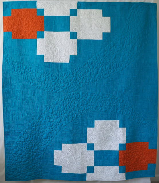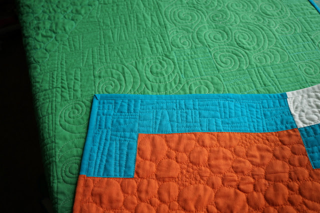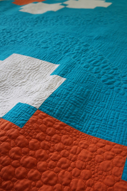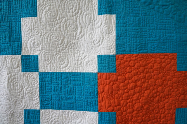 I wanted the orange crosses to relate to the large pebble swathes, so I quilted a different pebble configuration there, in Aurifil 2240. Just now, I'm realizing that I used the same free motion motif (swirls) in the white crosses here and the background of the other quilt (with Aurifil 2024). Sometimes I surprise myself. :) I really enjoy using the opposite of the piecing design to quilt (curvy vs. angular, for example).