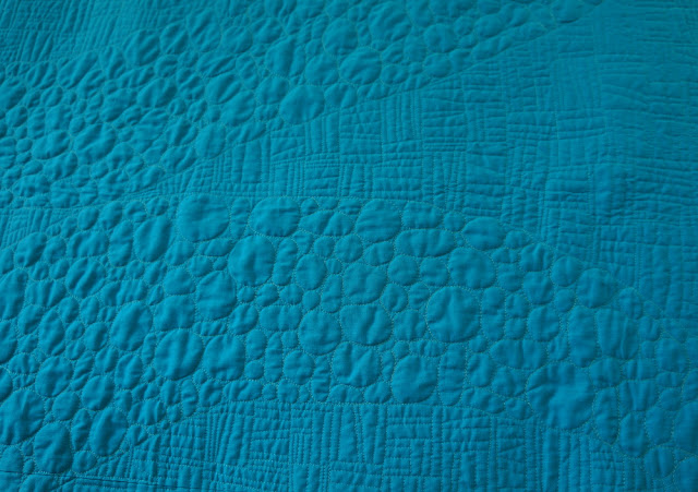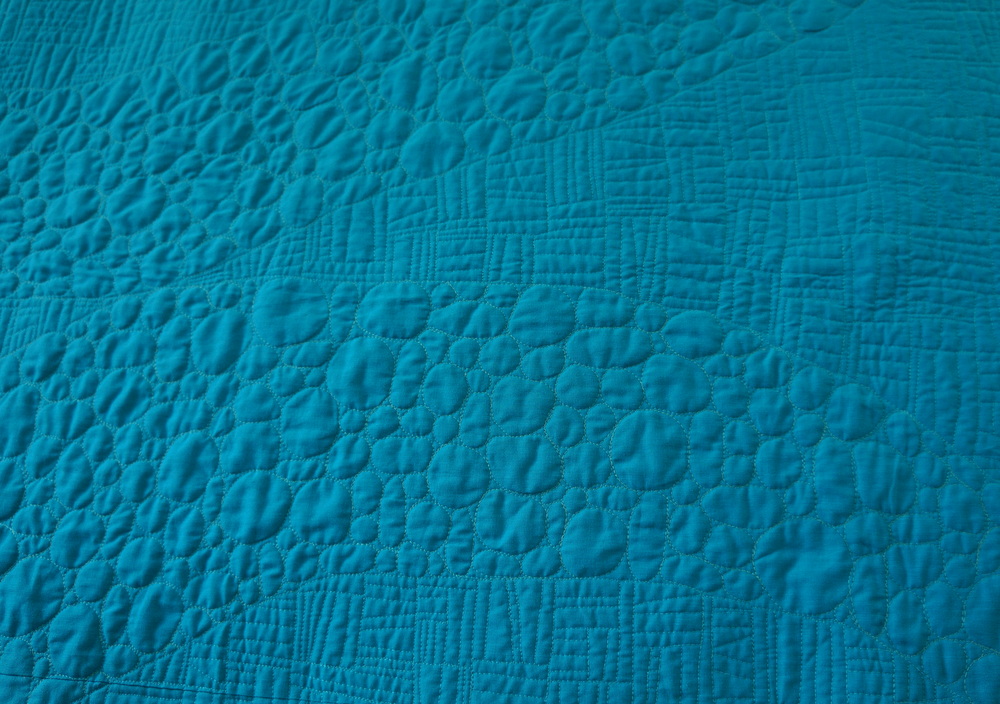 Contrast in size and shape of the quilting can often make the quilt. I used the same color and weight of thread (a beautiful, glow-y turquoise Aurifil 2810, 40 weight) for both the pebble paths and background, and changing scale in the negative space really makes the difference.