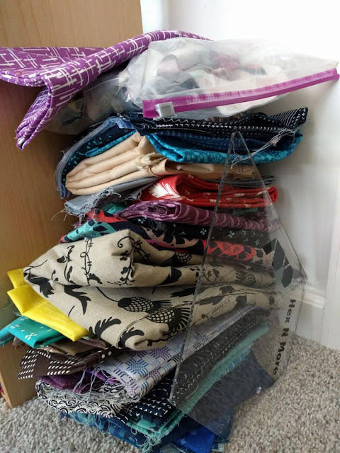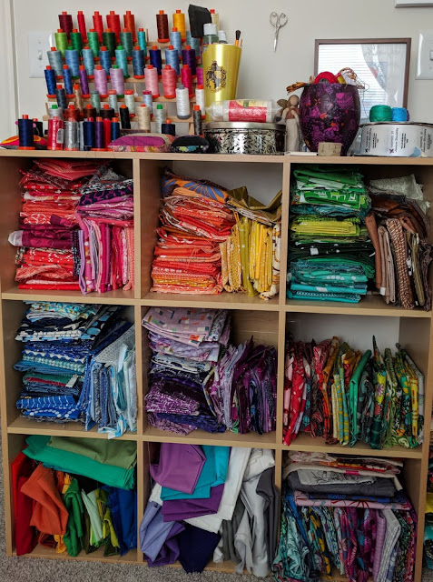 ReplyDeleteMy stash storage looks similar to yours but it's all in the closet of my sewing room. I use a cubby unit with my print fat quarters on the upper shelves and my solids and yardage on the lower ones. I wrap my yardage on magazine cards which really keeps things neat and tidy. I also use the clear plastic shoe boxes for all of my scraps, a bin for each color family. Those are stacked on the wire shelving that's in the closet. I'm trying really hard to use fabric that I already own instead of buying more. I have too much and it actually causes me more anxiety when trying to start a new project. I can't decide on fabrics to use. I guess too much of a good thing isn't necessarily good for me!
