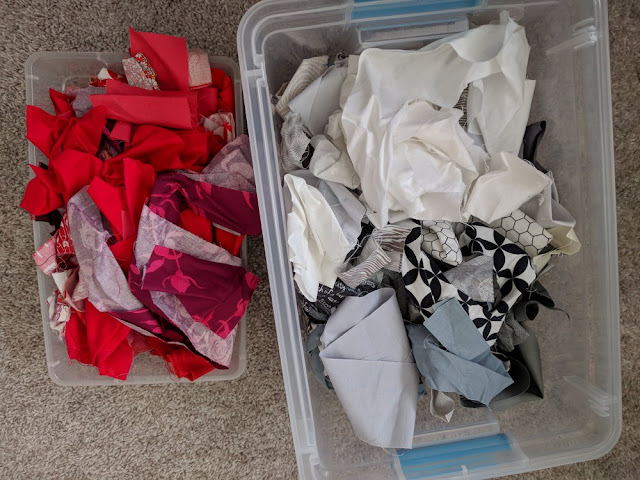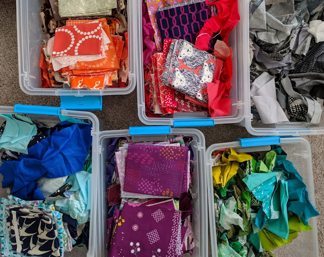 Now, I have more room to store scraps together. I combined colors together except for blue, purple, and green, which all needed their own bins (also, I have very few yellow scraps - believe it, Sarah! - so a small bin still holds those). I'm already feeling much more excited about diving into my scraps.