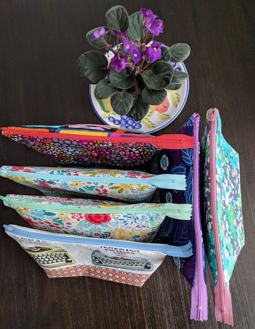 ReplyDeleteGreat pouches, I love all of the fun colors of fabric and zippers. My favorite little present to quilters are pincushions, you can never have too many :)
