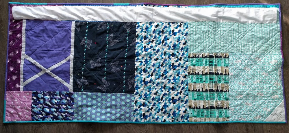 Mom wanted blues and purples for her living room, so I used several shades of ColorWorks Premium Solids (plus white and gray neutrals). Northcott Fabrics had just sent me a variety solids to play with, and I had just enough (and the right colors somehow!) to create a long wall-hanging; it seemed meant to be. I always love the bold colors and silky feel Northcott offers. Thank you, Northcott!