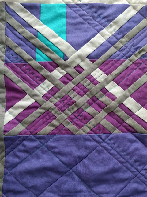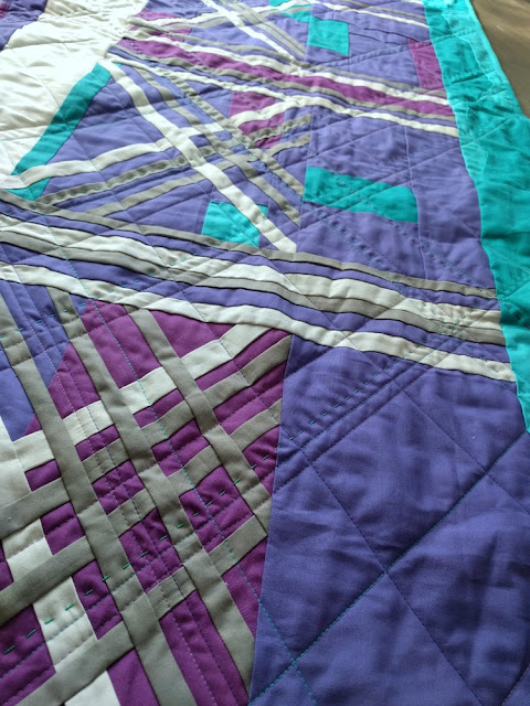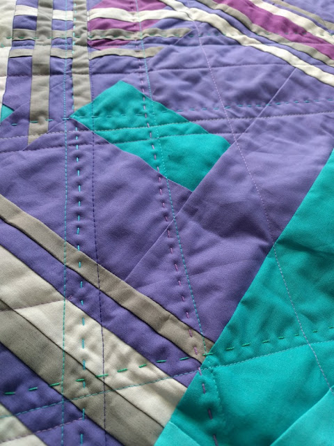 I quilted with a variety of techniques using both Aurifil on my machine and perle cotton by hand. In order to enhance the design of the quilt, I quilted long, extending lines alongside and in between the diagonal wood, all the way into the "sky" and "ocean " (the latter was pieced with improvised curves). Then, just because I love hand quilting now, too, I added in several lines. This detail really made the quilt for me, and it was a perfect, portable project to finish up as I traveled from NJ to Myrtle Beach. Yay, texture.