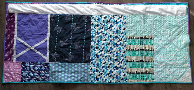 I realized after quilting that I had basted the back upside down - whoops. That's okay, though. I used an extra block from the front (it was going to be way too big) and pieced large scraps around it. Then, I sewed on the label and hanging sleeve. Mom promises she's going to hang it up soon, and I'll certainly share a picture on Instagram when she does.