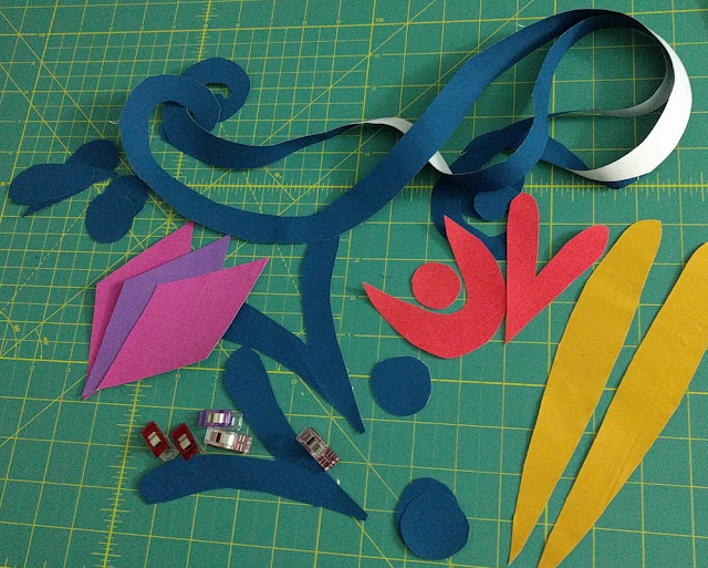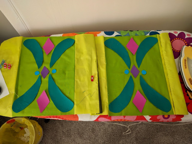 Recreating the dresses took quite a bit of sleuthing. It was really difficult to find detailed pictures of the designs from the movie itself, believe it or not. In screenshots, there are so many closeups and moving dresses! So I estimated and made it my own. After hand drawing and cutting out all the pieces, I adhered them to Heat-n-Bond Lite, which I then adhered to three pre-pieced panels.