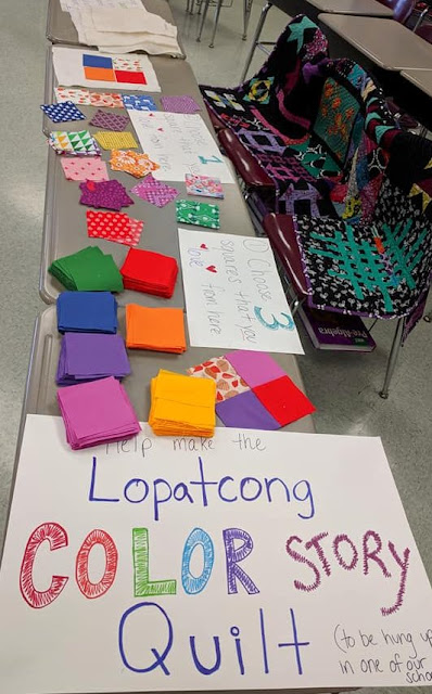 This year, I wanted to create a quilt project that relied on the color preferences of all who walked in (kids preschool age to middle school, plus parents and teachers). Think bright, bold, beautiful rainbows. I hoped that the quilt would contain many signatures and serve as a special piece in time for the town. Now that it's done and being exhibited around town, I'm thrilled to share it online as well!