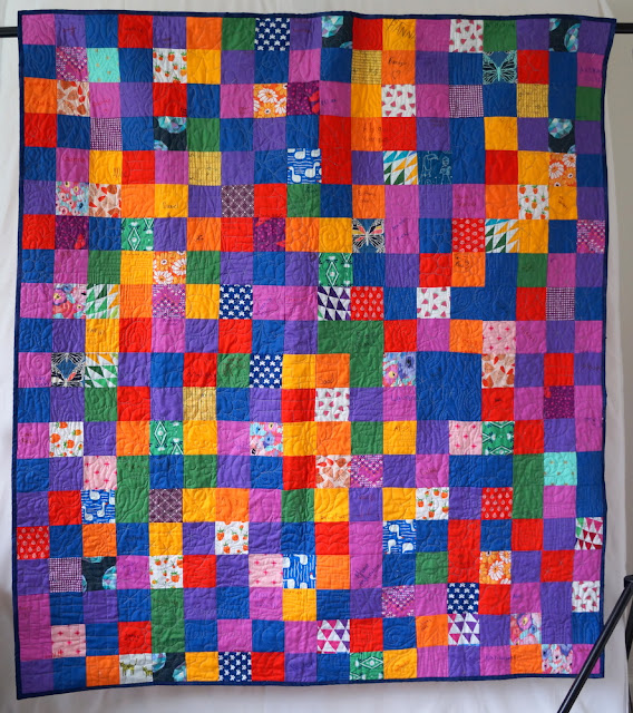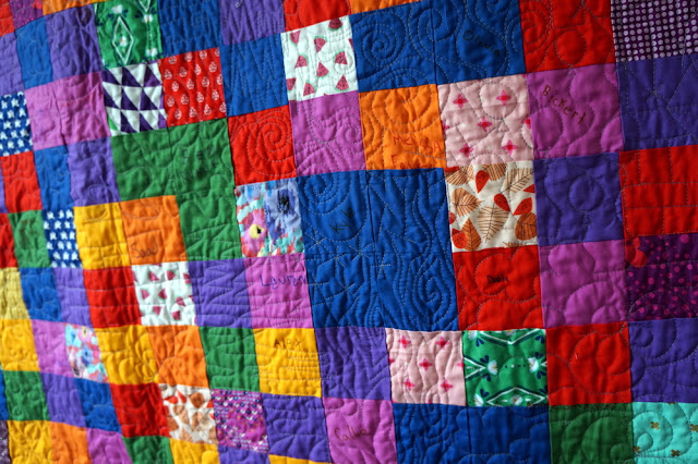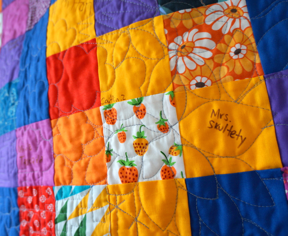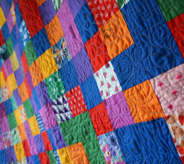 This year, I wanted to create a quilt project that relied on the color preferences of all who walked in (kids preschool age to middle school, plus parents and teachers). Think bright, bold, beautiful rainbows. I hoped that the quilt would contain many signatures and serve as a special piece in time for the town. Now that it's done and being exhibited around town, I'm thrilled to share it online as well!