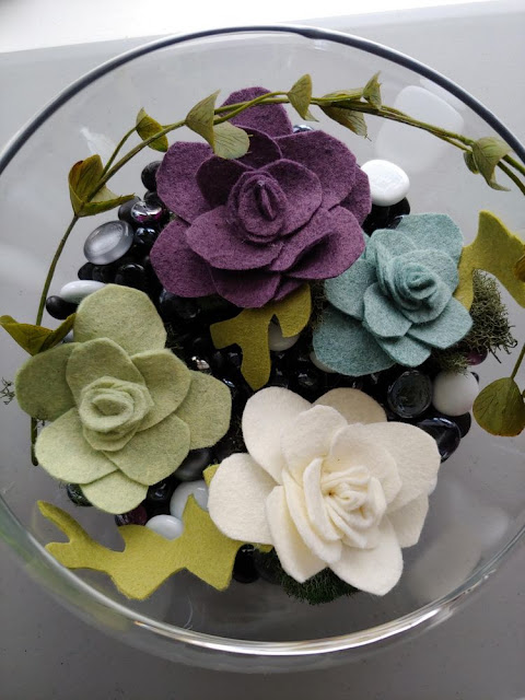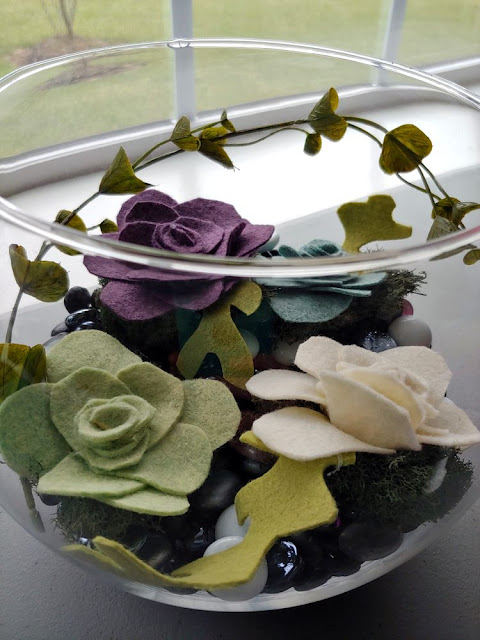 I also made my mother-in-law her own terrarium. She'll never have to worry about watering these succulents (tutorial from Benzie Design, where I get my felt!).
