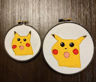 I made these little embroidery wall hangings for my husband and his best friend, who love Pokemon and especially the infamous Surprised Pikachu meme.