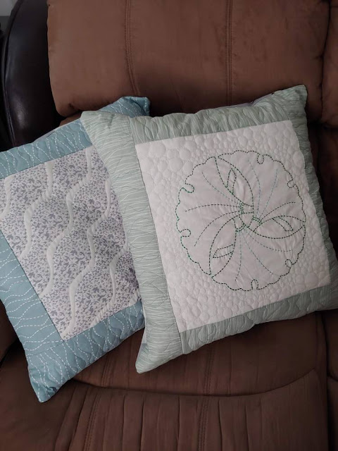 Pillow for my mom - the sashiko ginkgo leaves (pattern from Easy Piecing) on the right were done early in the year. Always knew I'd make it into a pillow for her; I've made several sashiko pillows at this point and one other just for her! :)