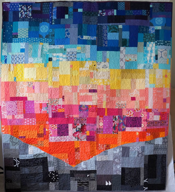This quilt (72" x 78") was made over several months of 2018, using lots of special scraps and brick by brick improvisation, which I used to teach. It was all about creating a seamless transition between each color. When you look at the sky, do you ever wonder how those color change? I do, constantly!