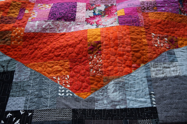 The gray mountains were appliqued on after I pieced the sky. I wanted them to switch from light to dark gray, as if the sun was still lighting up part of the mountaintops. That's not really what I typically see from the highway, but this creates more interest. :) The binding also transitions between colors.