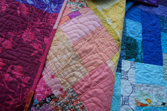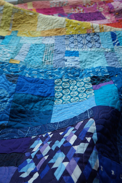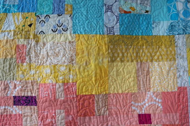 So, each block has pieces of the colors surrounding it, which makes it have a pixelated look. What I LOVE about planned improvisation is that there's always a plan, but I never know exactly what the quilt will look like when it's done. I also quilted each color differently (and into the next color) to further emphasize the transition. It was fun coming up with the various motifs and pairing up Aurifil threads: 1320, 4020, 1133, 2600, 1243, 1135, and 2605.